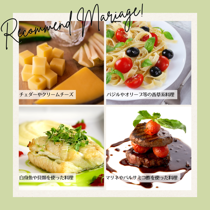 マリネなどのお酢を使った料理やマスタードの酸味と相性が良いです。バルサミコ酢、トマトソースを使った料理もおすすめです。