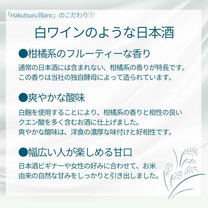 白身魚や貝類のさっぱりとした風味には、「Blanc」のやさしい米の旨みがよく合います。